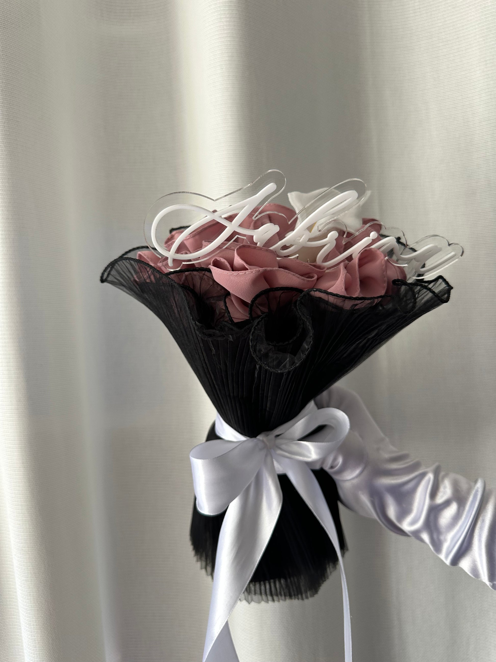 Hijab bouquet composed of a medina silk hijab (color of your choice), an artificial flower and a personalization.