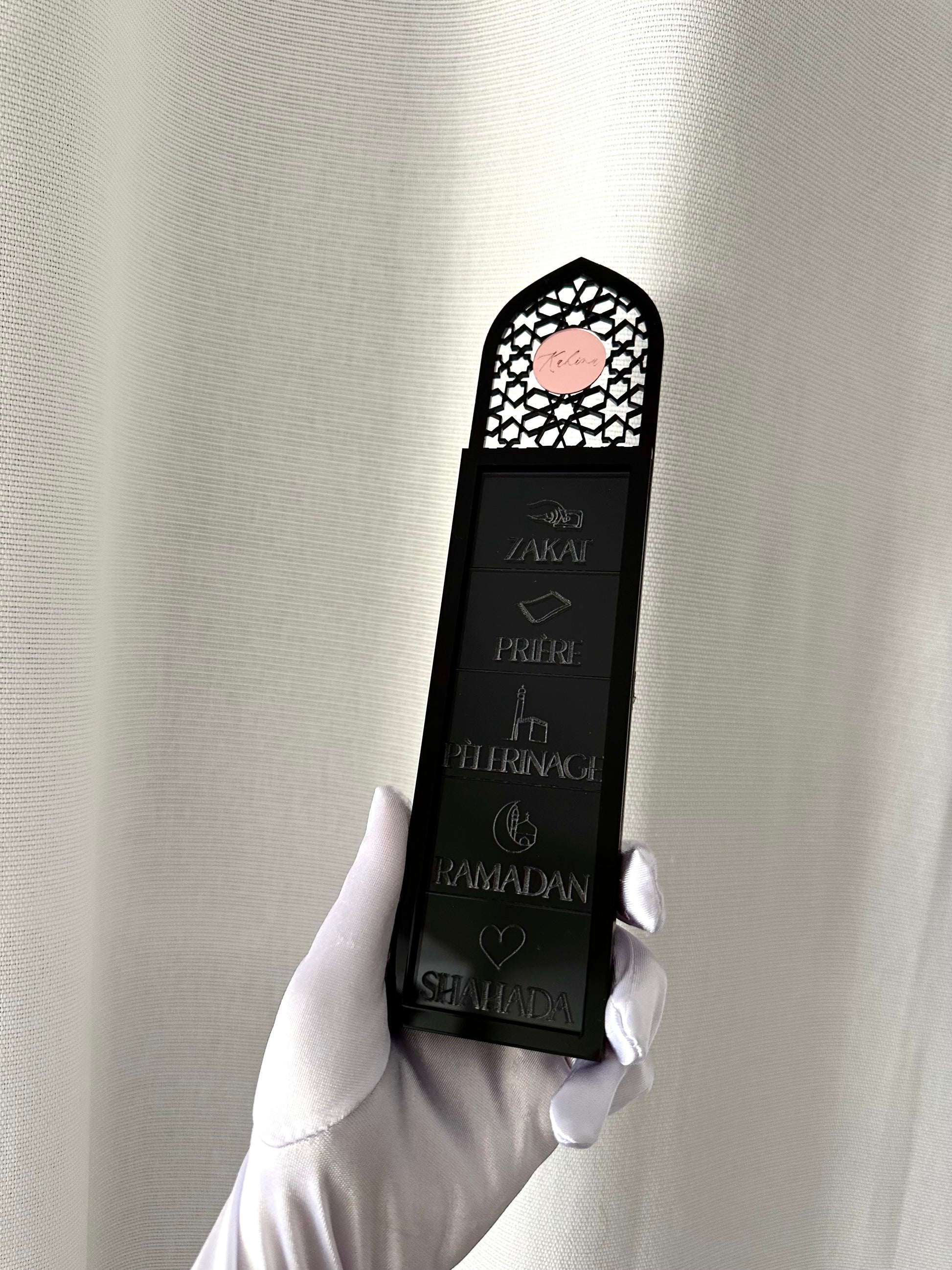 Apprenez les 5 piliers de l’Islam grace à notre nouveau produit : chaque pilier appris doit être mis dans la plaque